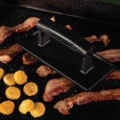 The pre-seasoned cast iron Bacon Press will enable you to evenly heat your bacon to the crispiness you desire and can even be used to make grilled sandwiches come lunchtime! The two 4” diameter egg rings are ideal for keeping your eggs, sausage, pancakes, and hash browns the perfect size for your sandwich. Each silicone ring is dishwasher-safe for your convenience once you’re done at the griddle.