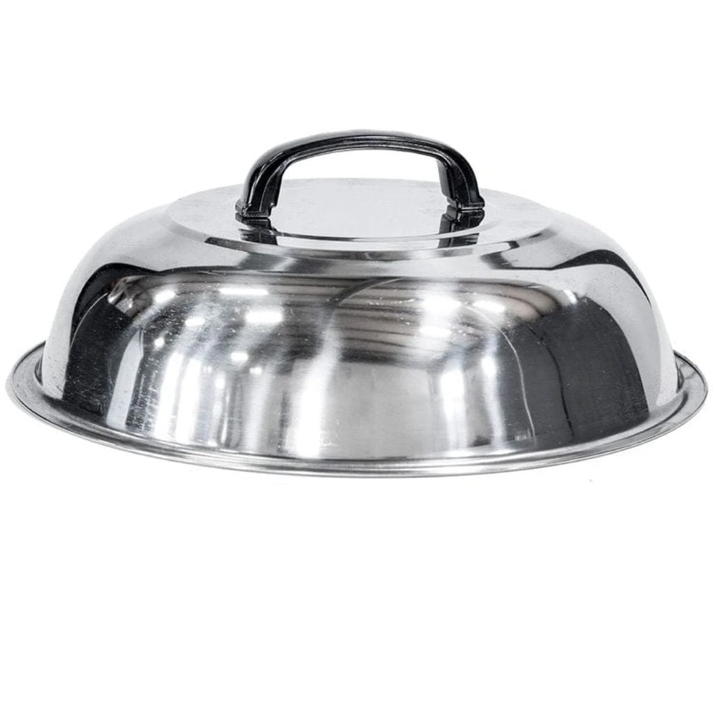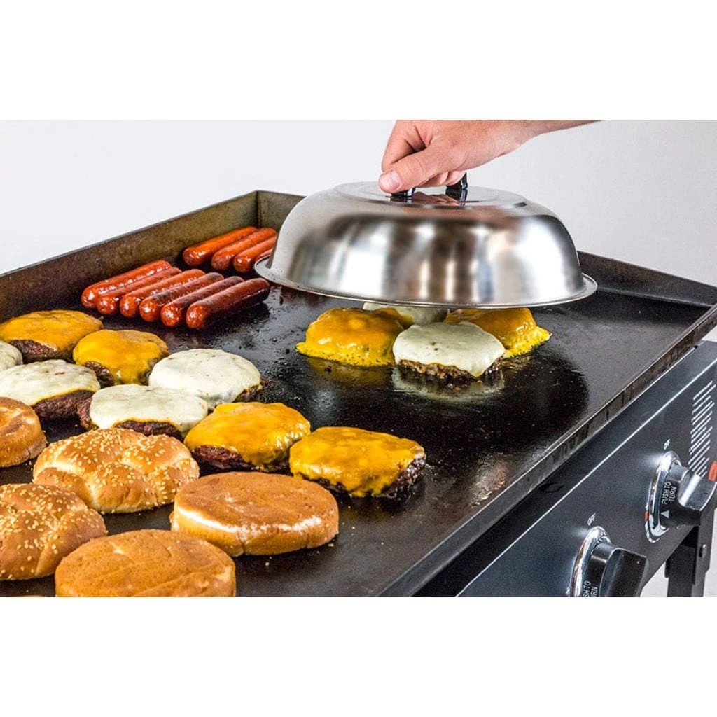 Use the Blackstone 12″ Round Basting Cover to quickly and easily melt cheese on hamburgers or Philly Cheesesteaks. Steam vegetables and create an oven-like environment to reduce cooking time. The heat-resistant handle will stay cool to the touch. Perfect for use on a griddle or grill.