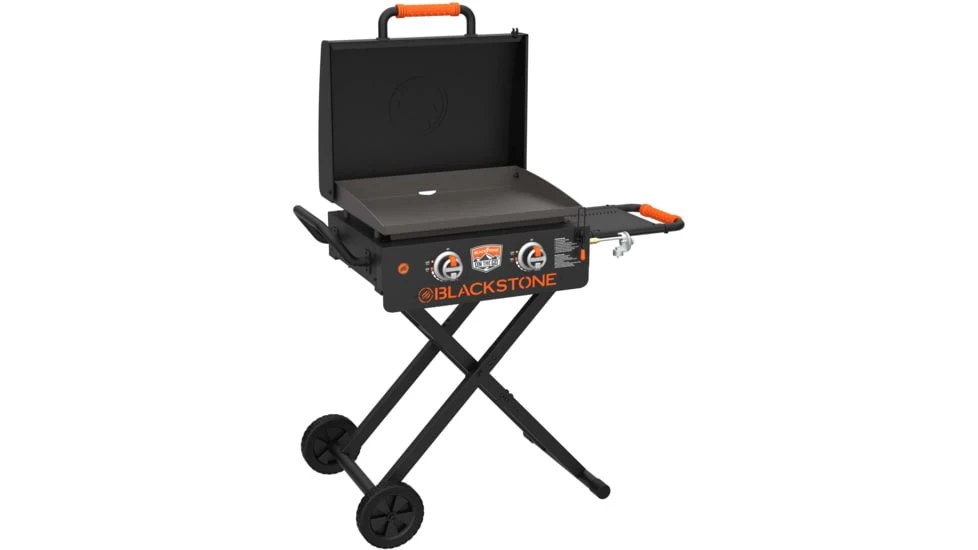 The new Blackstone On The Go 22 Scissor Cart Griddle W/Hood is here to improve how you cook outside. Whether you are making breakfast, lunch, or dinner, this collapsible scissor cart is perfect for any On The Go chef. It quickly heats up with a total of 24,000 BTUs through two H style burners that provide even heat distribution for optimal cooking across the whole griddle. The painted hood with orange OTG handle grip helps to lock in heat to keep your food juicy and flavorful and helps keep it clean till you are ready to cook again.![]()